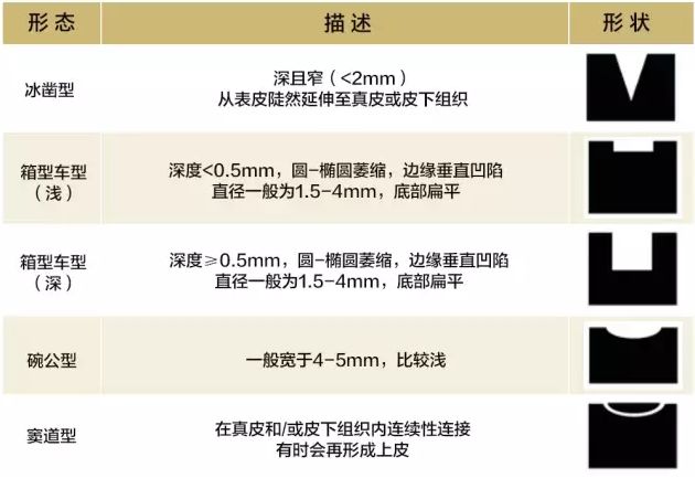 冰凿型,又称凹陷型。以痤疮为主,瘢痕狭窄(2mm),点状且深邃,开口较宽,底部为漏斗状。疤痕形状窄且深,形成坑。这通常是较深的丘疹或囊肿损伤了毛囊引起的。