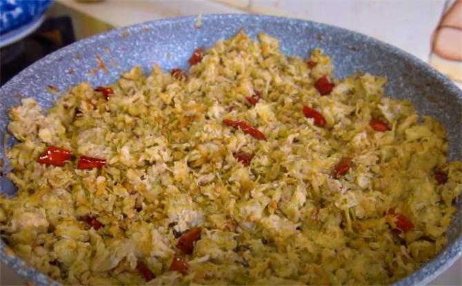 4.锅里倒一些油,油热了放葱花,喜欢吃辣的多放点辣椒段,然后加一点点生抽调味,把蒸好的槐花倒进去,拌匀之后就能出锅了。
